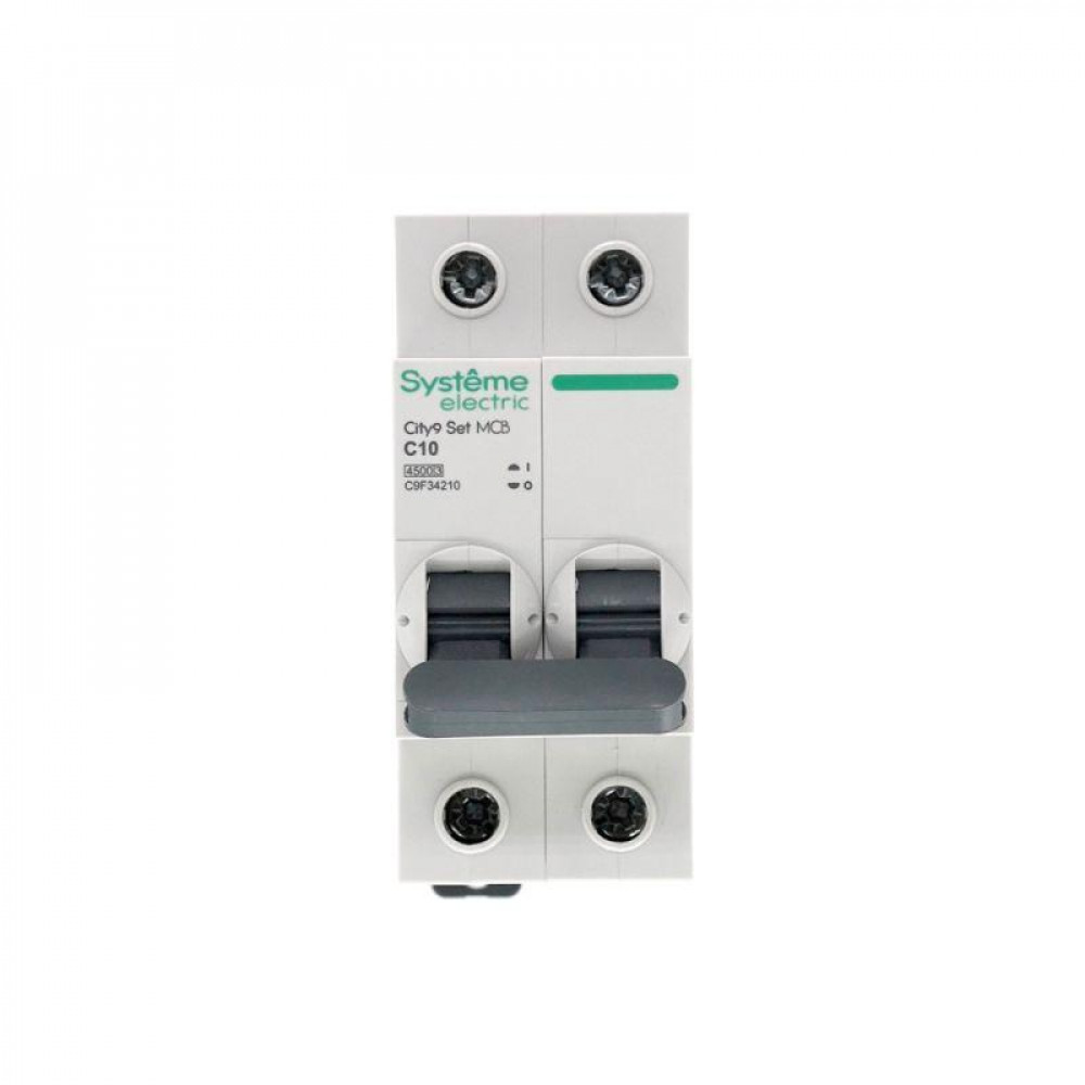 Автоматический выключатель серии City9 Set Systeme Electric, 2-полюсный, номинальный ток 10 А, характеристика С, Icn = 4.5 кА. Применяется в электрических сетях напряжением 230 В. Предназначен для защиты от перегрузок и токов короткого замыкания. Оснащен механизмом «мгновенной коммутации». Ударопрочный корпус из специального пластика с 6 металлическими заклепками. Безопасные клеммы исключают попадание кабелей в заклеммное пространство.