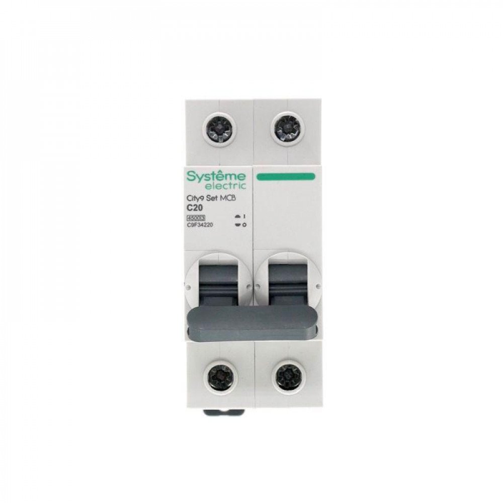 Автоматический выключатель серии City9 Set Systeme Electric, 2-полюсный, номинальный ток 20 А, характеристика С, Icn = 4.5 кА. Применяется в электрических сетях напряжением 230 В. Предназначен для защиты от перегрузок и токов короткого замыкания. Оснащен механизмом «мгновенной коммутации». Ударопрочный корпус из специального пластика с 6 металлическими заклепками. Безопасные клеммы исключают попадание кабелей в заклеммное пространство.
