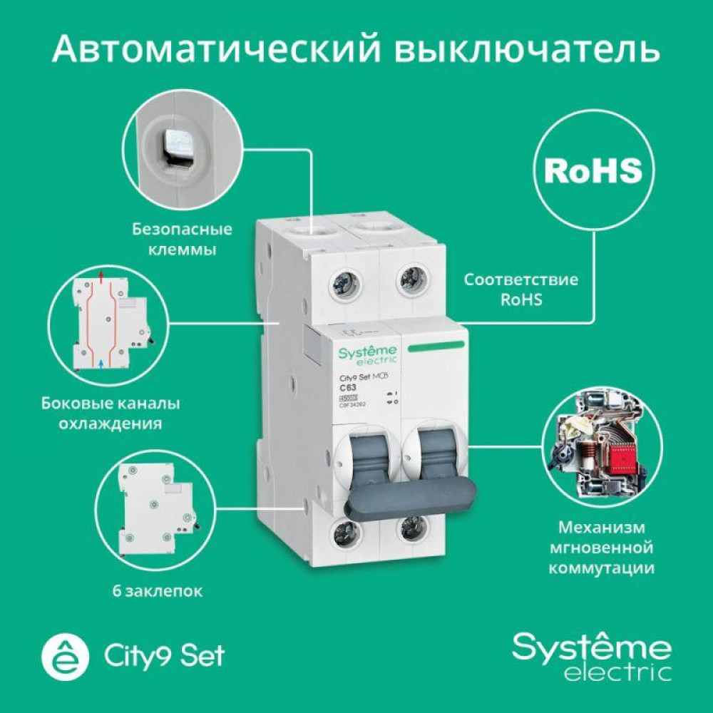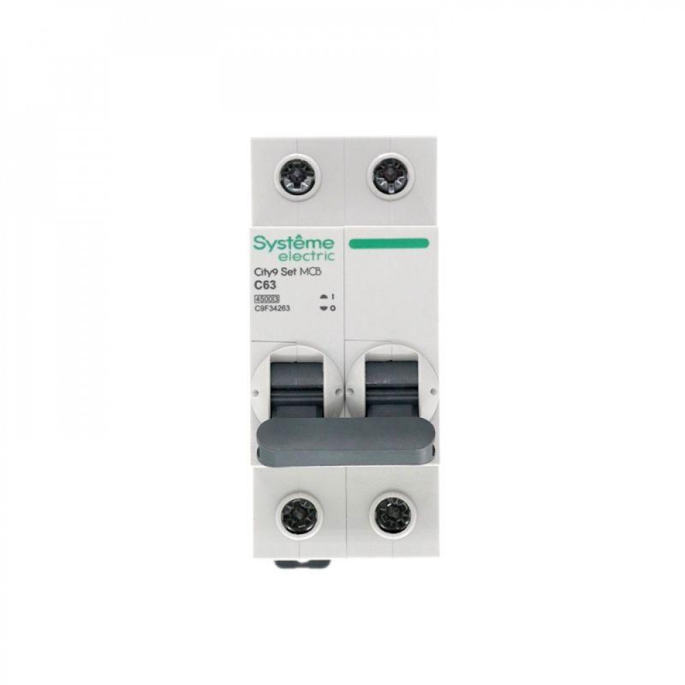 Автоматический выключатель серии City9 Set Systeme Electric, 2-полюсный, номинальный ток 63 А, характеристика С, Icn = 4.5 кА. Применяется в электрических сетях напряжением 230 В. Предназначен для защиты от перегрузок и токов короткого замыкания. Оснащен механизмом «мгновенной коммутации». Ударопрочный корпус из специального пластика с 6 металлическими заклепками. Безопасные клеммы исключают попадание кабелей в заклеммное пространство.