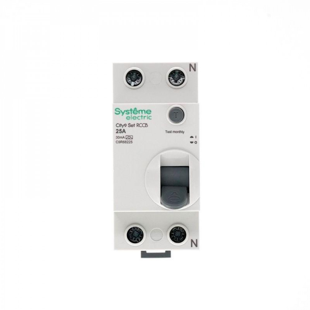 Выключатель дифференциального тока (ВДТ) или устройство защитного отключения (УЗО) серии City9 Set Systeme Electric, 2-полюсный, номинальный ток 25А, ток утечки 30 мА, тип А, электромеханический. Применяется в электрических сетях напряжением 230В. Уставка по току утечки 30 мА обеспечивает гарантированную защиту людей при прямом и косвенном прикосновении. Кнопка тест обеспечивает проверку работоспособности аппарата. Крепление на DIN-рейку шириной 35 мм. Подключение сверху и снизу. Безопасные клеммы.