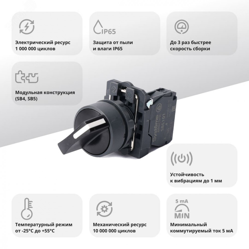 ← Переключатель модульный SB4 в сборе 22мм 2поз. с фиксацией ключ 1пол 1НО SE SB4BG21