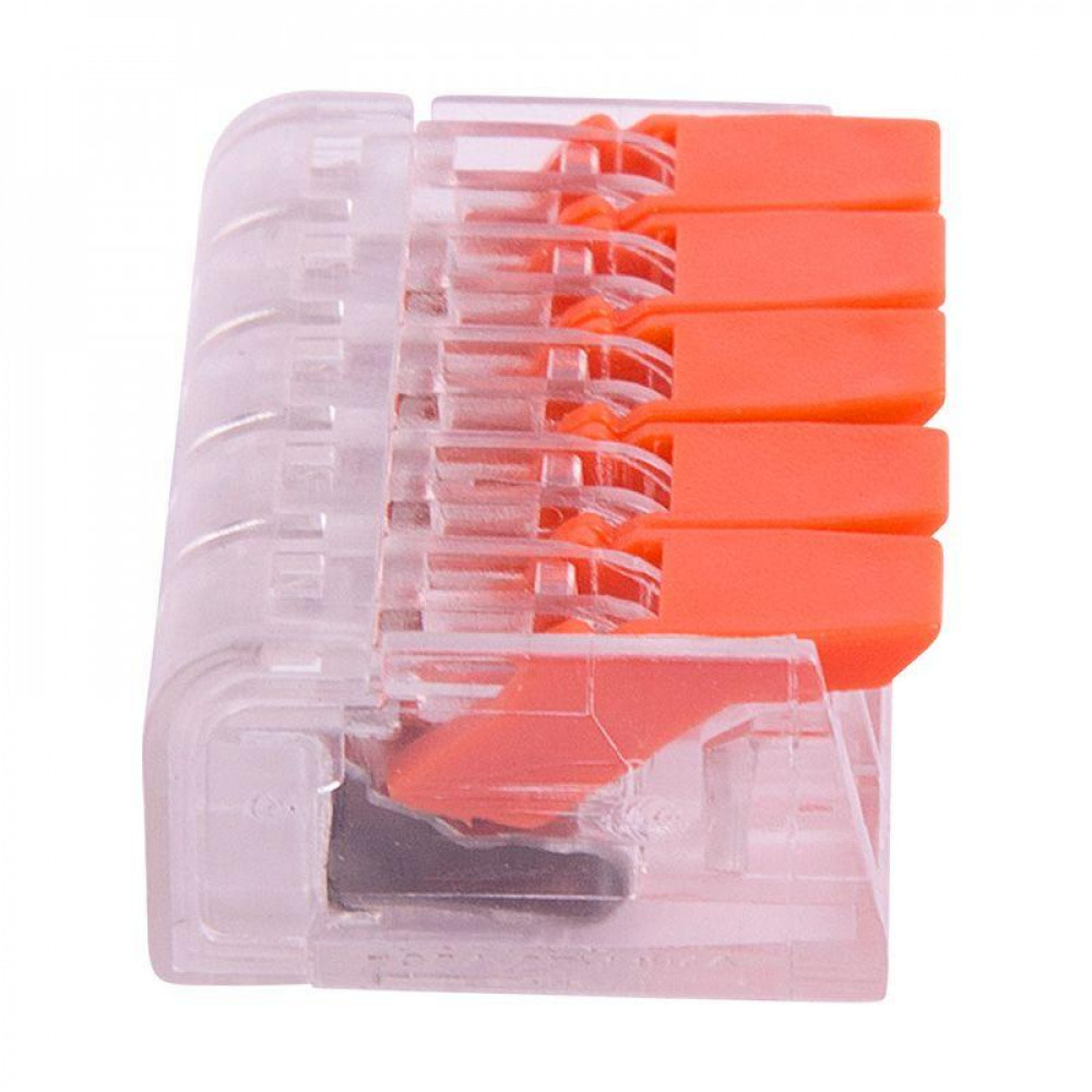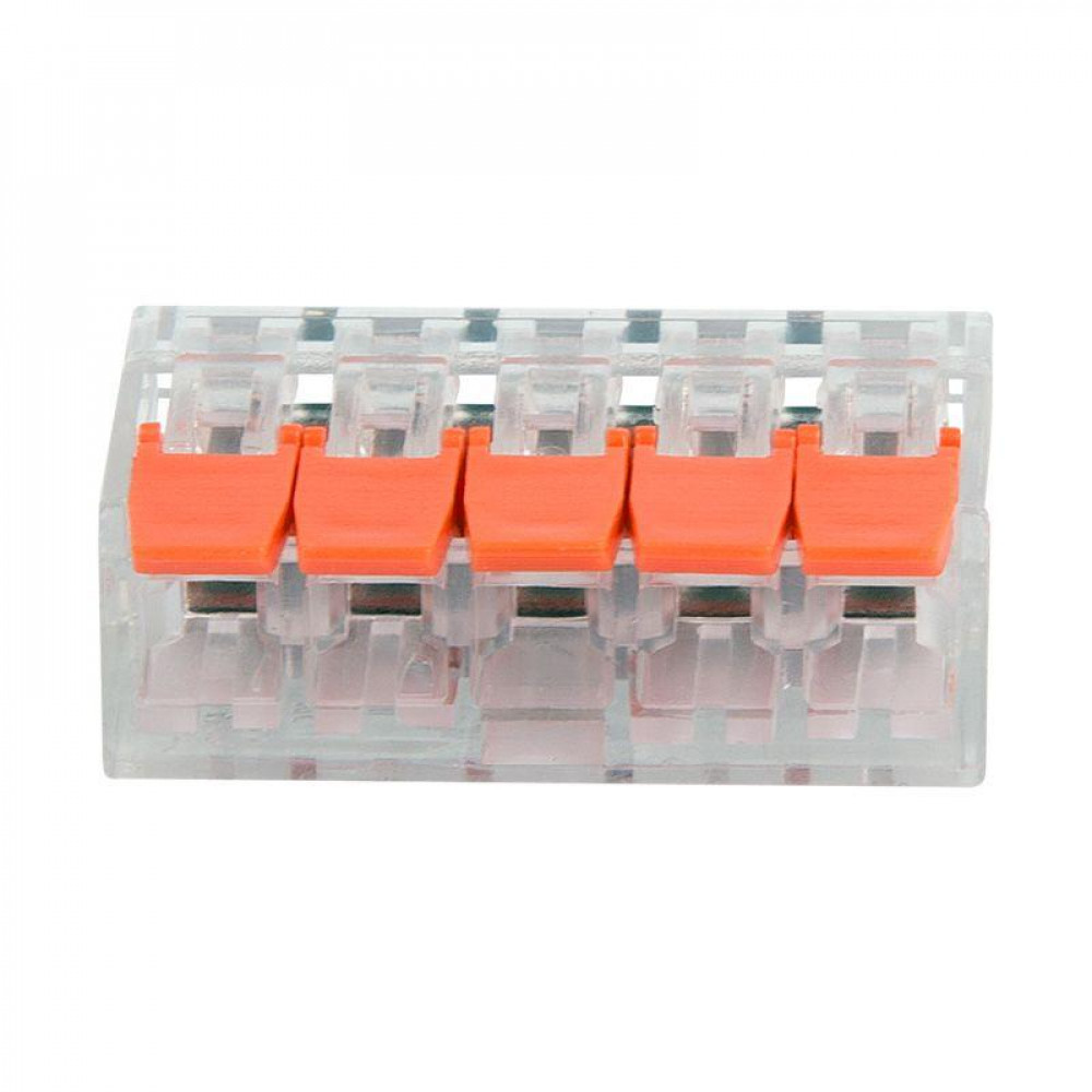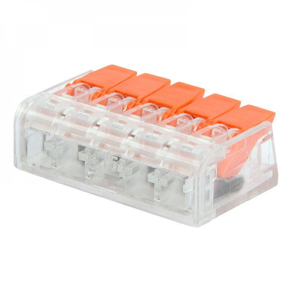 Рычажная клемма, соединительная, универсальная, 5 полюсов, сечение проводника 0,08 - 4,0 мм кв., 250V, 32A,цвет корпуса: прозрачный, цвет рычагов: оранжевый,в упаковке 50 штук (Аналог 221-415)