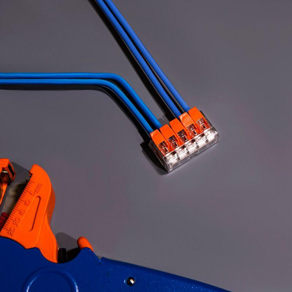 Рычажная клемма, соединительная, универсальная, 5 полюсов, сечение проводника 0,08 - 4,0 мм кв., 250V, 32A,цвет корпуса: прозрачный, цвет рычагов: синий,в упаковке 30 штук (Аналог 221-415)