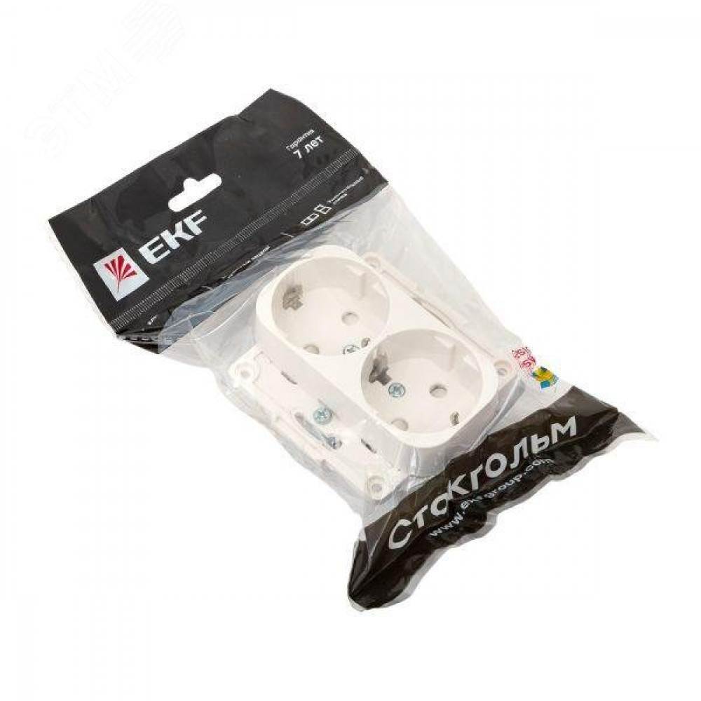 Описание Розетка 2-м СП Стокгольм 16А IP20 с заземл. защ. шторки механизм бел. PROxima EYR16-128-10