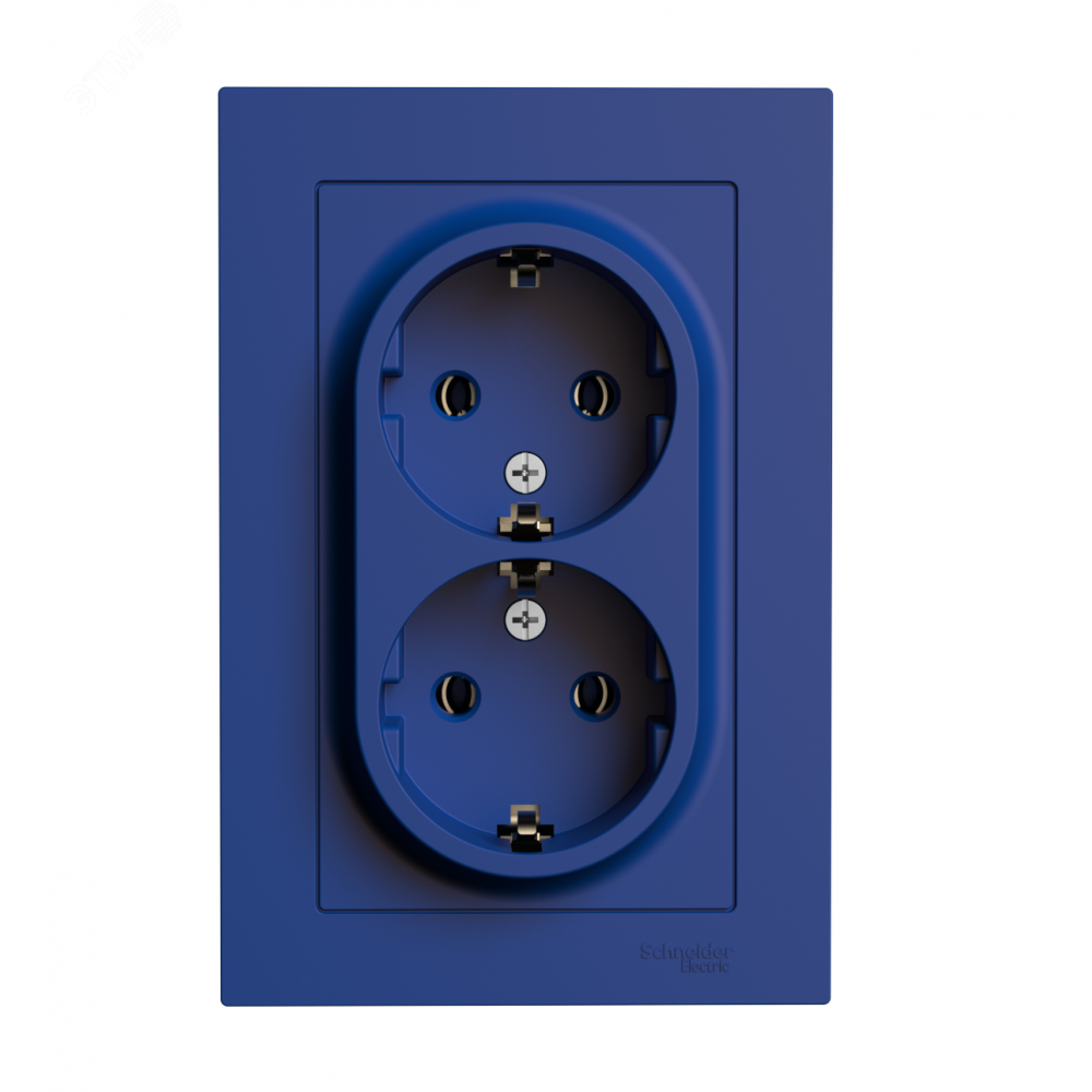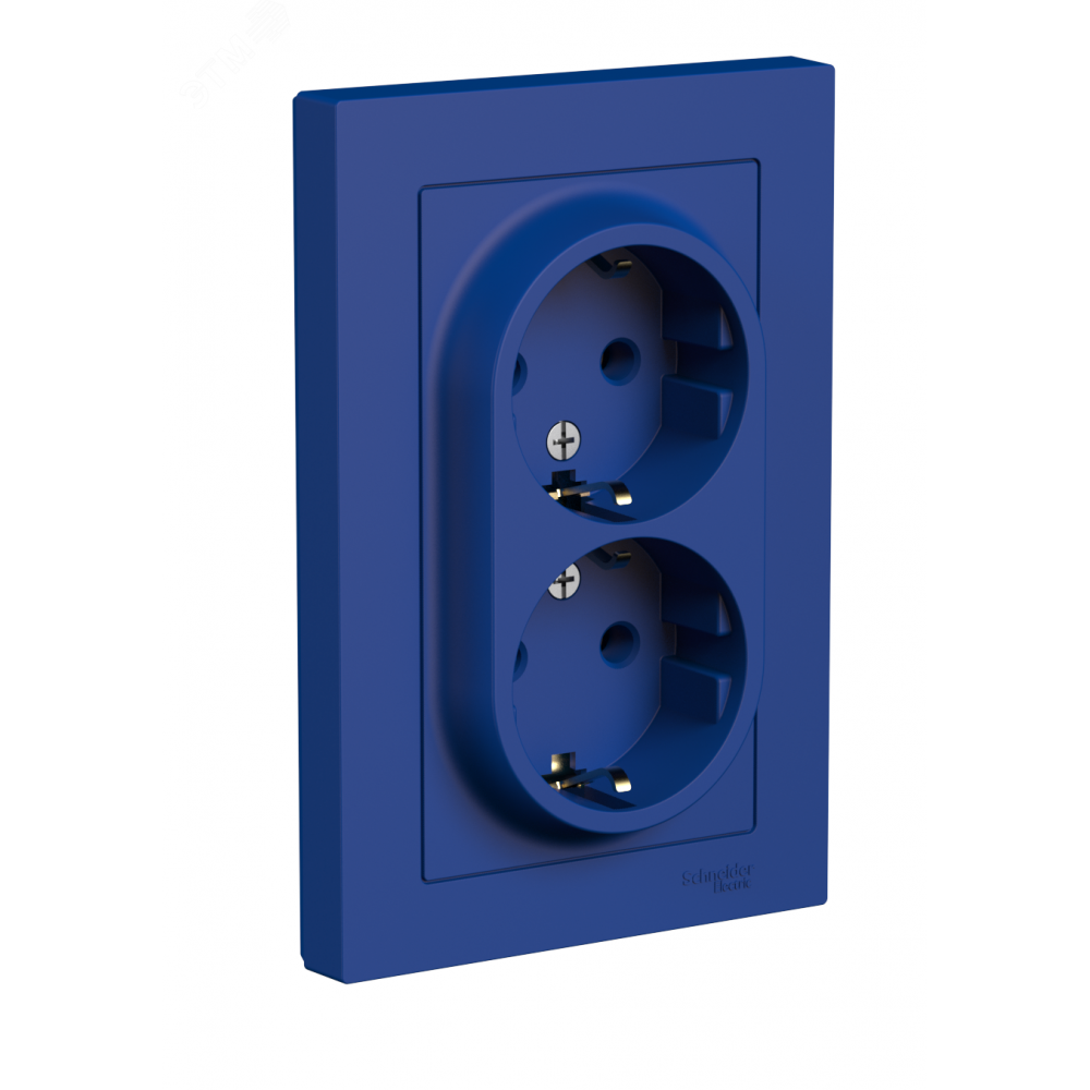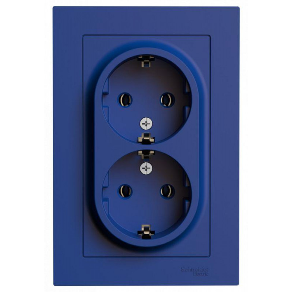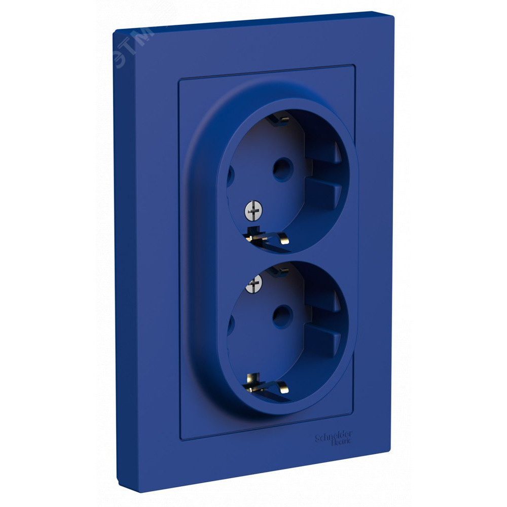 Розетка двойная Systeme Electric (ранее Schneider Electric) серии AtlasDesign (в сборе, цвет аквамарин) с заземлением, без шторок подходит для сетей 250 В, на ток 16 А.