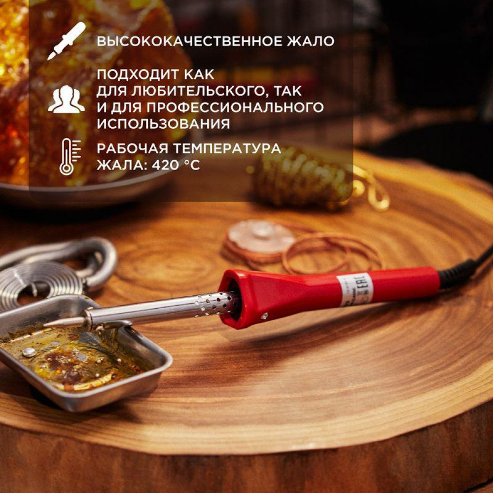 Паяльник выполнен с керамическим нагревательным элементом, поэтому нагревается быстрее, чем нихромовый и при бережном отношении прослужит много долгих лет. Долговечное жало паяльника состоит из медного сердечника, покрытого слоем электролитически осажденного железа. Рабочая часть жала электрохимически покрыта слоем олова (что обеспечивает облуживаемость), а остальная поверхность — хромирована.