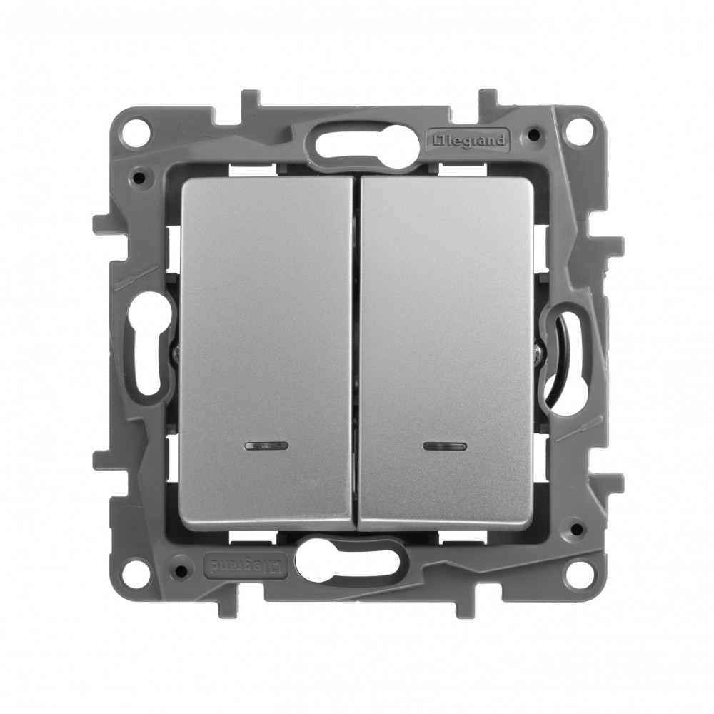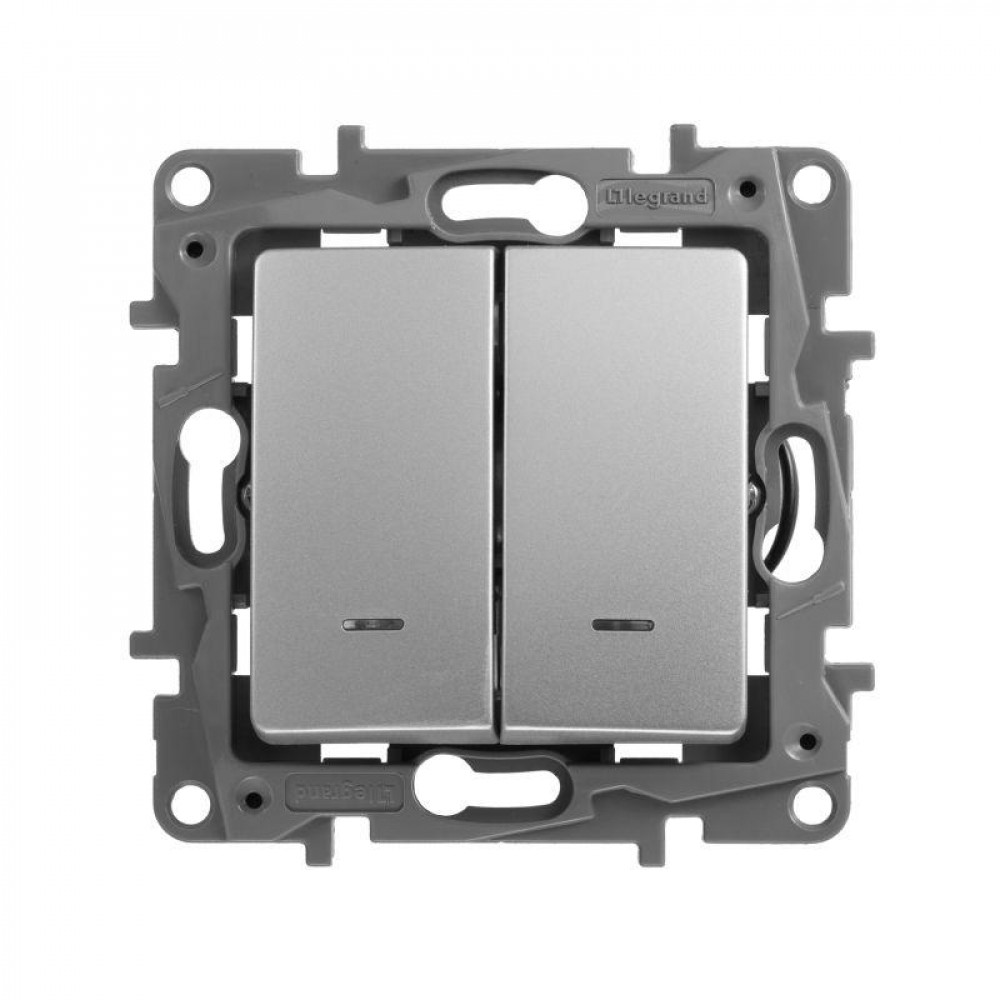 Описание Выключатель 2-кл. СП Etika 10А IP20 250В 10AX с подсветкой/индикацией авт. зажимы механизм алюм. Leg 672404