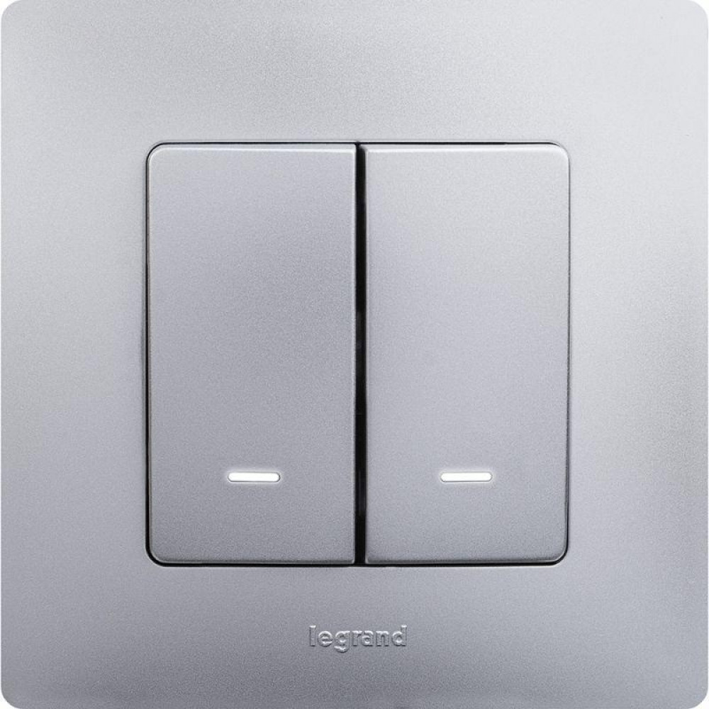 Выключатель 2-кл. СП Etika 10А IP20 250В 10AX с подсветкой/индикацией авт. зажимы механизм алюм. Leg 672404, Выключатель и переключатель скрытого монтажа