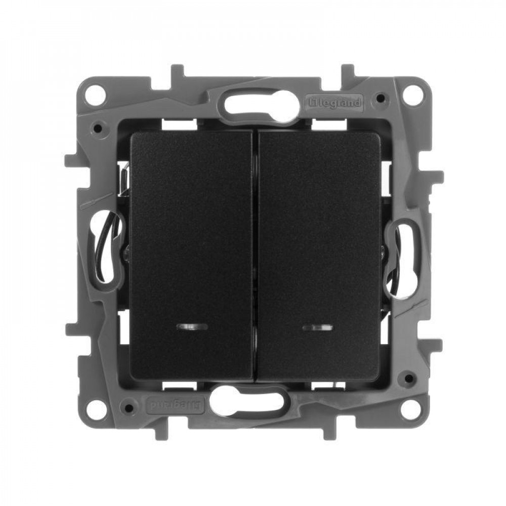 Описание Выключатель 2-кл. СП Etika 10А IP20 250В 10AX с подсветкой/индикацией авт. зажимы механизм антрацит Leg 672604
