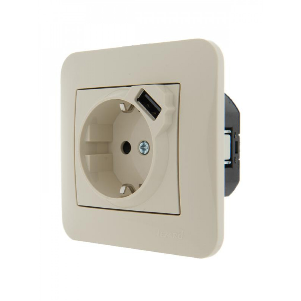 Описание Розетка 1-м СП Karina 16А с заземл. с заряд. устройством USB механизм крем. 707-0388-181