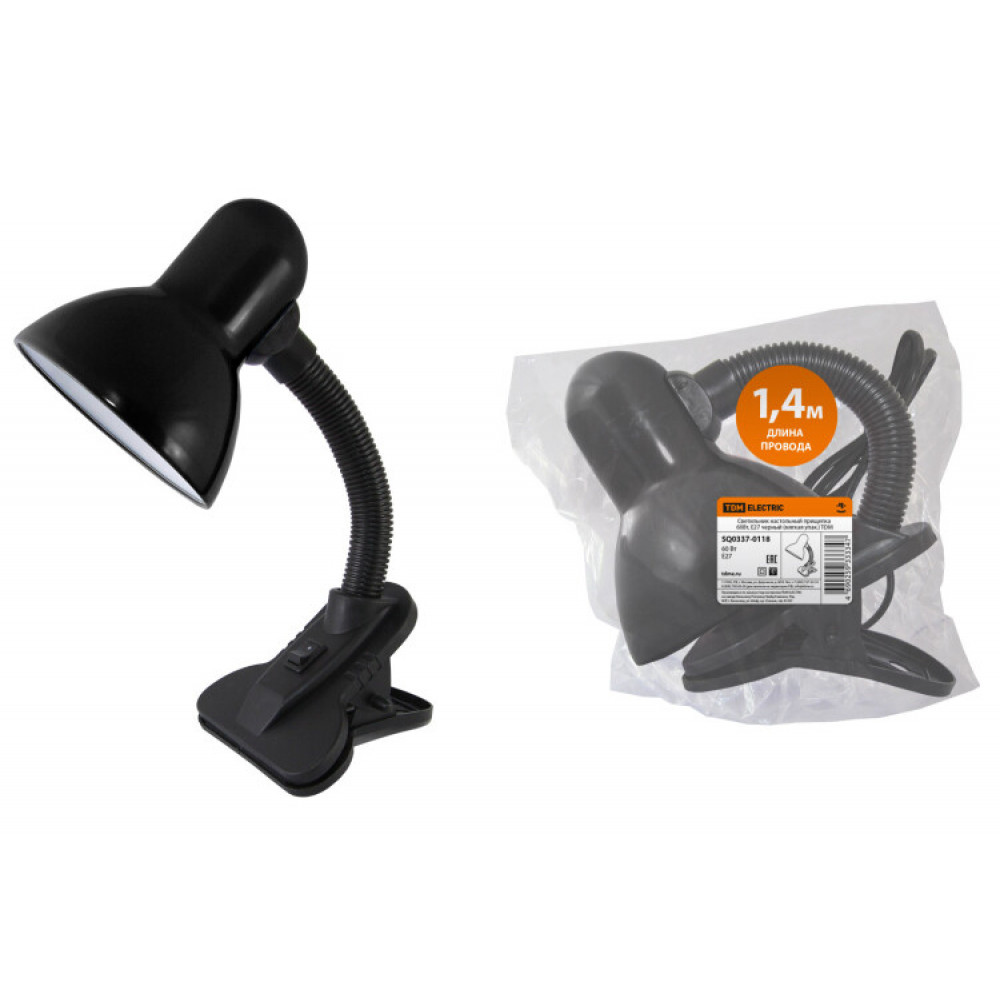 Описание Светильник настольный прищепка 60Вт, E27 черный (мягкая упак.) TDM (кр.10шт) нМ