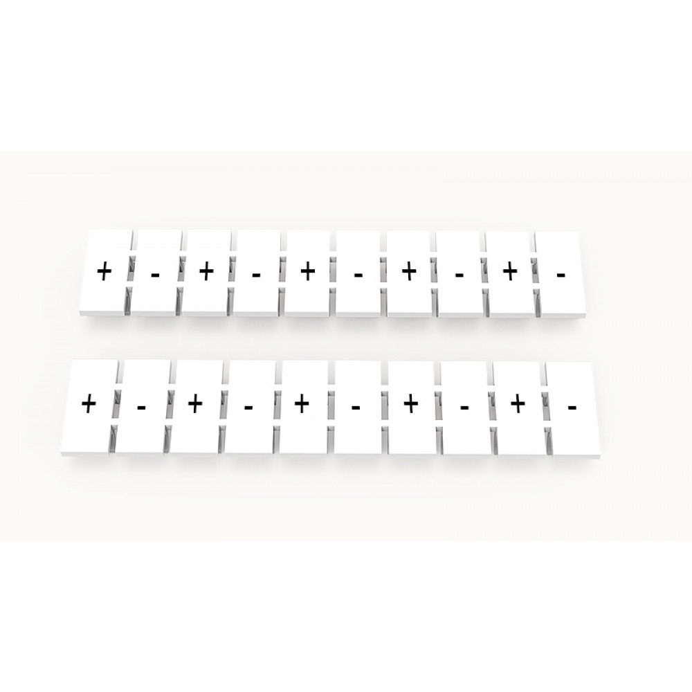 Кассета с маркировочными шильдиками, для клемм сечением 2,5 мм.кв., верхняя, 10 шильдиков, нанесенные символы: + - + - + - + - + - …, с вертикальным расположением, размер шильдика: 4,55 x 10,7 мм, цвет: белый