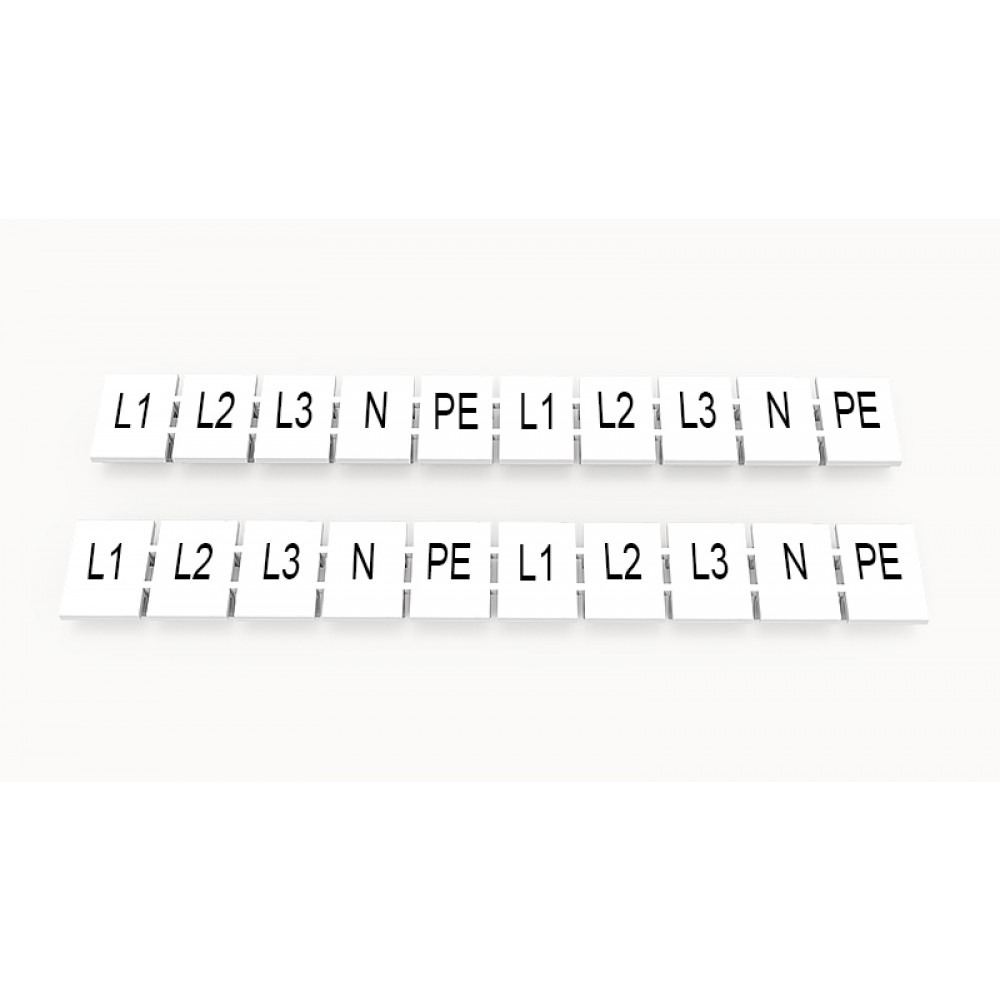 Кассета с маркировочными шильдиками, для клемм сечением 6 мм.кв., верхняя, 10 шильдиков, нанесенные символы: L1 L2 L3 N PE L1 L2 L3 N PE, с вертикальным расположением, размер шильдика: 7,45 x 10,7 мм, цвет: белый