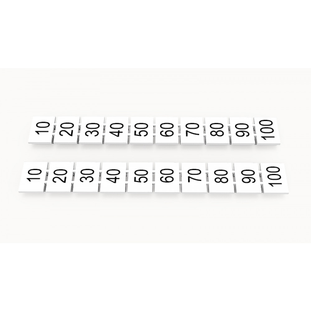 Кассета с маркировочными шильдиками, для клемм сечением 6 мм.кв., верхняя, 10 шильдиков, нанесенные символы: 10 20 30 40 50 60 70 80 90 100, с горизонтальным расположением, размер шильдика: 7,45 x 10,7 мм, цвет: белый
