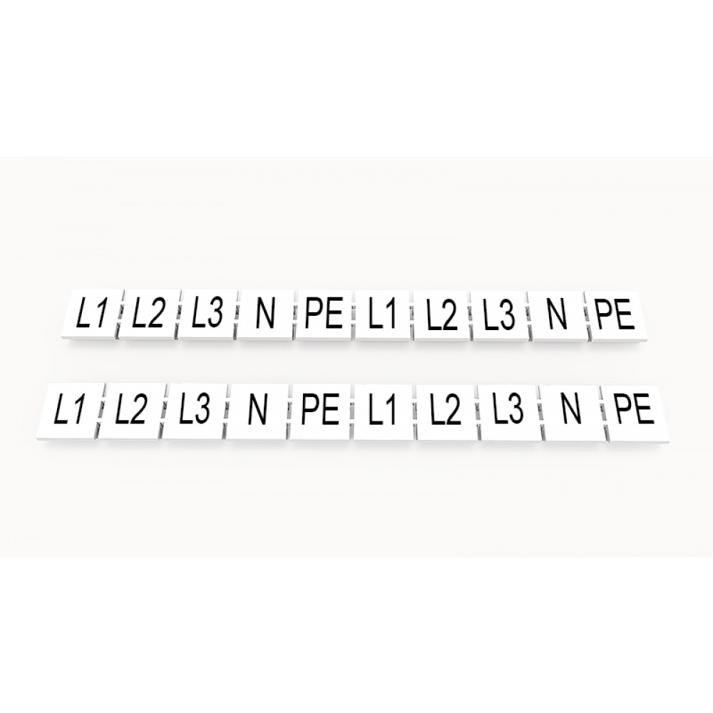 Кассета с маркировочными шильдиками, для клемм сечением 10 мм.кв., верхняя, 10 шильдиков, нанесенные символы: L1 L2 L3 N PE L1 L2 L3 N PE, с вертикальным расположением, размер шильдика: 9,3 x 10,7 мм, цвет: белый