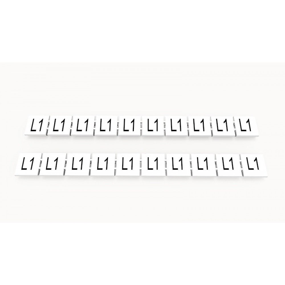 Кассета с маркировочными шильдиками, для клемм сечением 10 мм.кв., верхняя, 10 шильдиков, нанесенные символы: L1, с вертикальным расположением, размер шильдика: 9,3 x 10,7 мм, цвет: белый