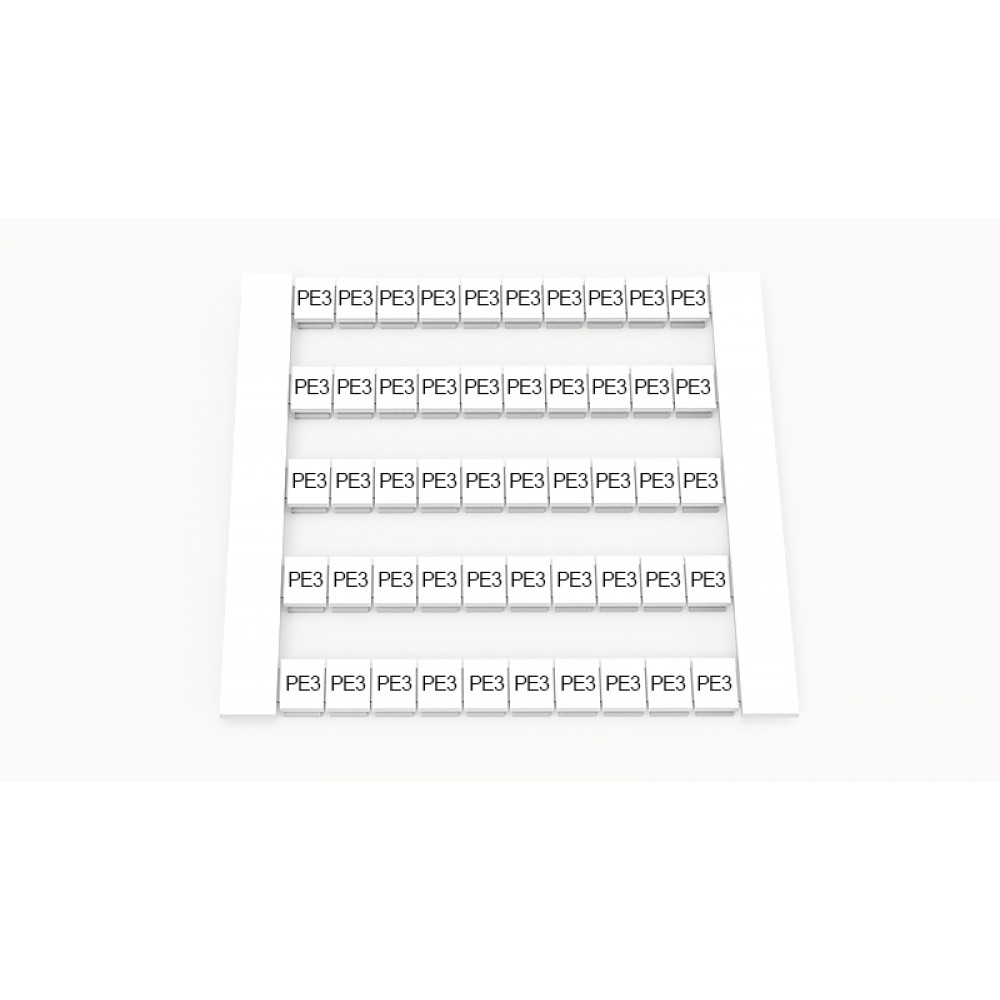 Маркировка (в кассетах) DEK5-50P-19-153Z(H), Кассета с маркировочными шильдиками, для клемм сечением 2,5 мм.кв., боковая, 50 шильдиков, нанесенные символы: PE3, с вертикальным расположением, размер шильдика: 4,8 x 5,5 мм, цвет: белый