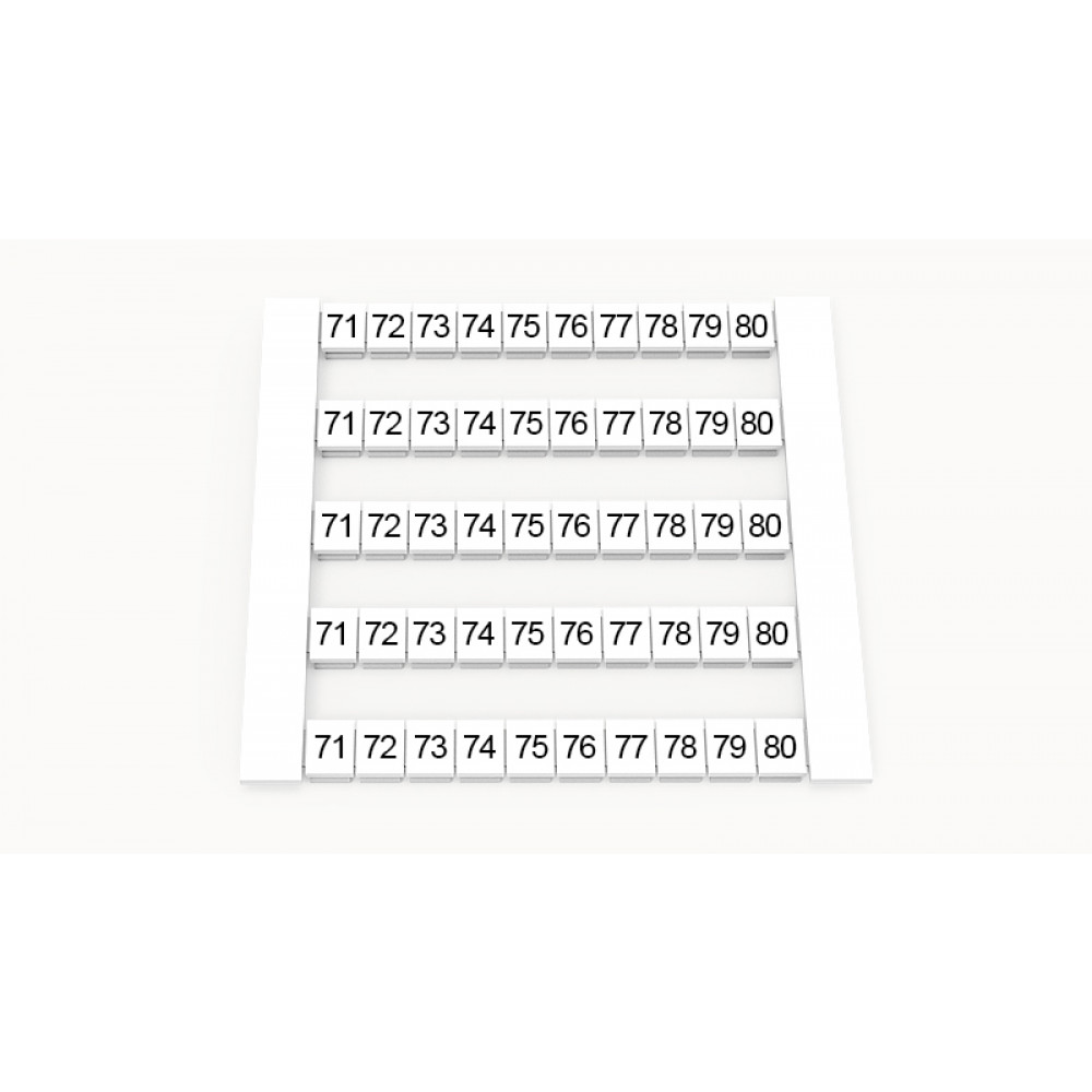 Кассета с маркировочными шильдиками, для клемм сечением 2,5 мм.кв., боковая, 50 шильдиков, нанесенные символы: 71...80, с вертикальным расположением, размер шильдика: 4,8 x 5,5 мм, цвет: белый