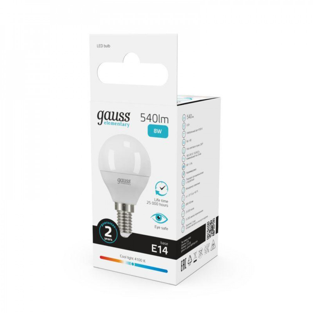 Описание Лампа светодиодная Elementary 8Вт P45 шар 4100К нейтр. бел. E14 540лм 53128