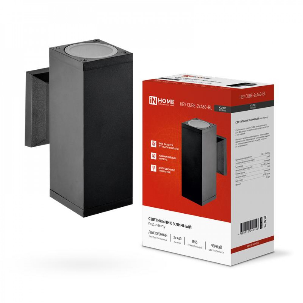 Описание Светильник НБУ CUBE-2хA60-BL E27 IP65 уличный настенный двусторонний алюм. под лампу 2хA60 черн. 4690612045153
