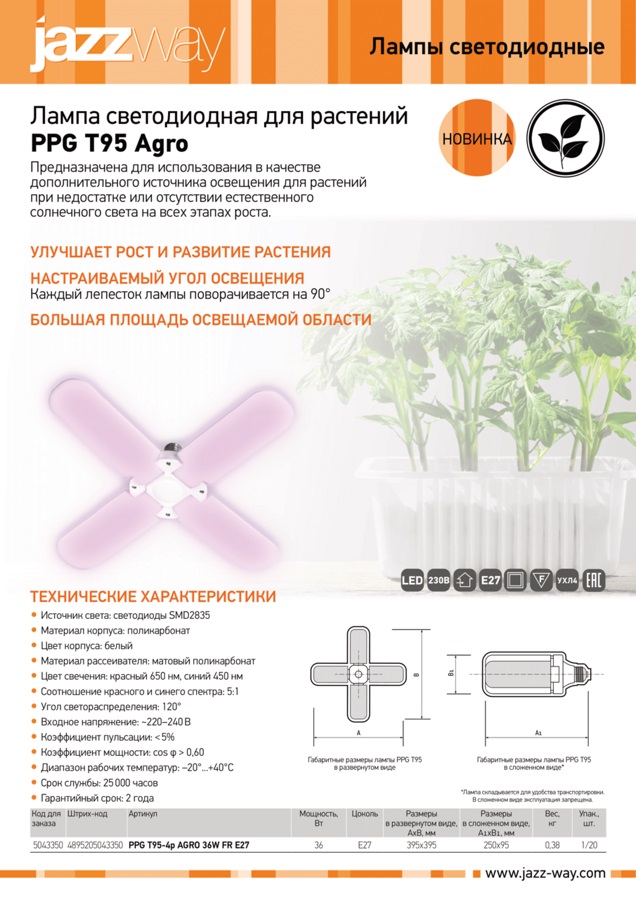 Описание Лампа светодиодная PPG T95-4p AGRO 36Вт FR E27 4 лепестка с поворотом 90град. для растений красн. 650нм/син. 450нм 5043350