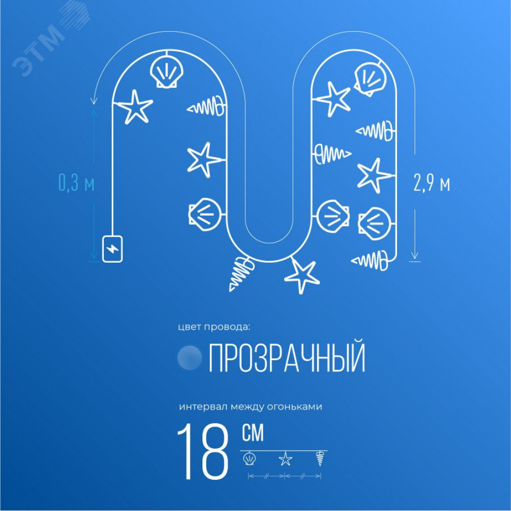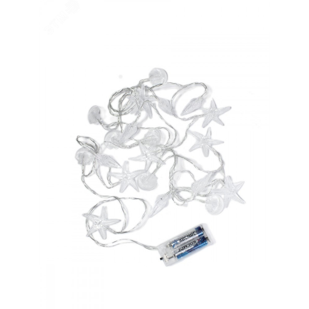 Описание Гирлянда светодиодная "Морская" (ракушки звезды раковины) 20LED 2.9+0.3м акрил син. КОСМОС KOC_GIR-B113