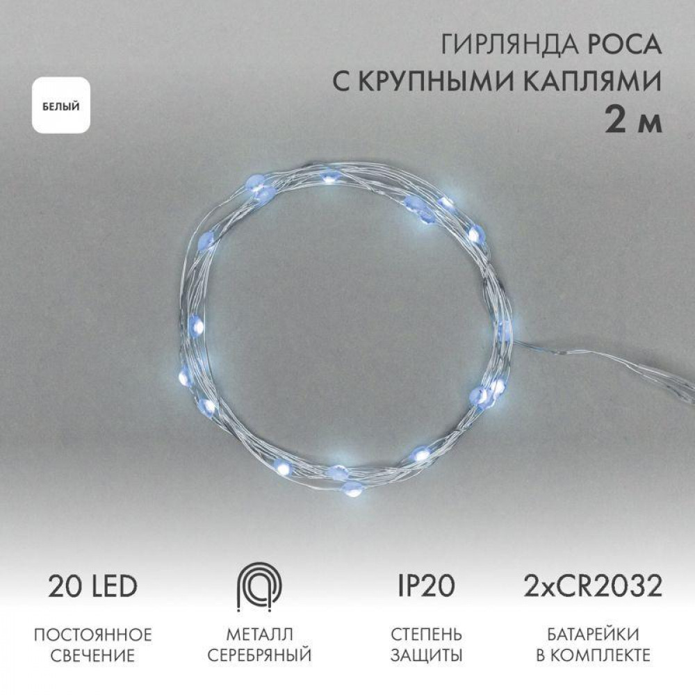 Гирлянда светодиодная "Роса" с крупными каплями 2м 20LED бел. 0.1Вт IP20 элементы питания 2хCR2032 (в компл.) 302-005, Светильник декоративный