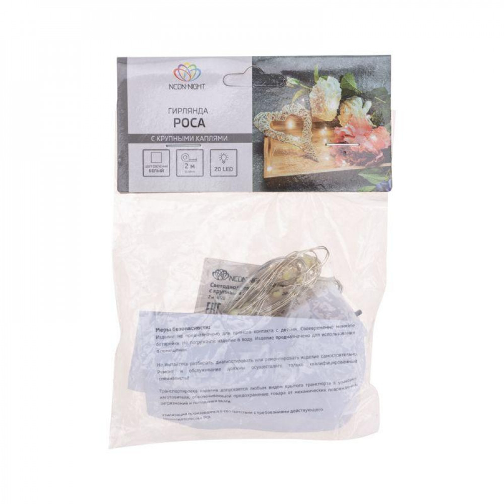 Описание Гирлянда светодиодная "Роса" с крупными каплями 2м 20LED бел. 0.1Вт IP20 элементы питания 2хCR2032 (в компл.) 302-005
