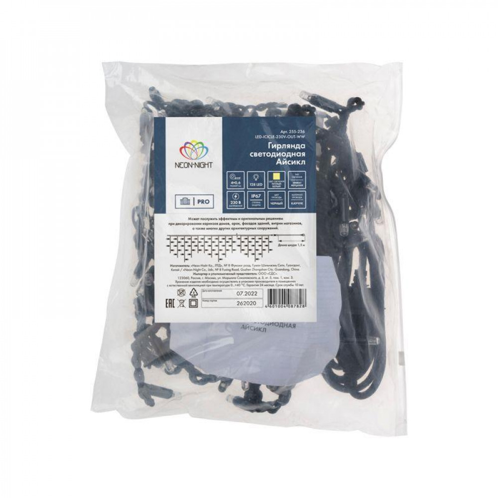 Описание Гирлянда светодиодная "Айсикл" (бахрома) 4х0.6м 128LED тепл. бел. 10Вт 230В IP67 эффект мерцания провод каучук черн. (нужен шнур питания 315-000) 255-236