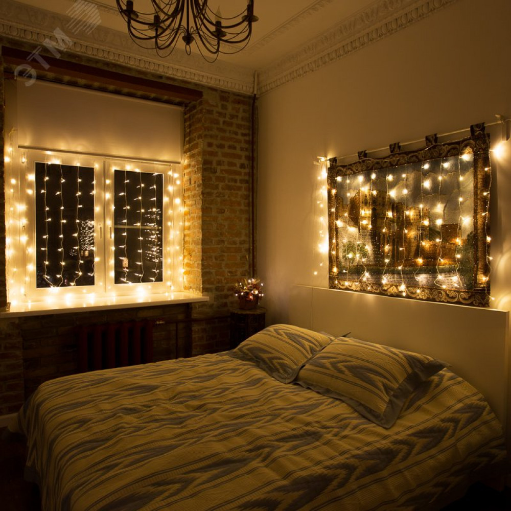 Гирлянда светодиодная "Светодиодный Дождь" 1.5х1м 96LED тепл. бел. 8Вт 230В IP20 с контроллером провод прозр. 235-026, Светильник декоративный