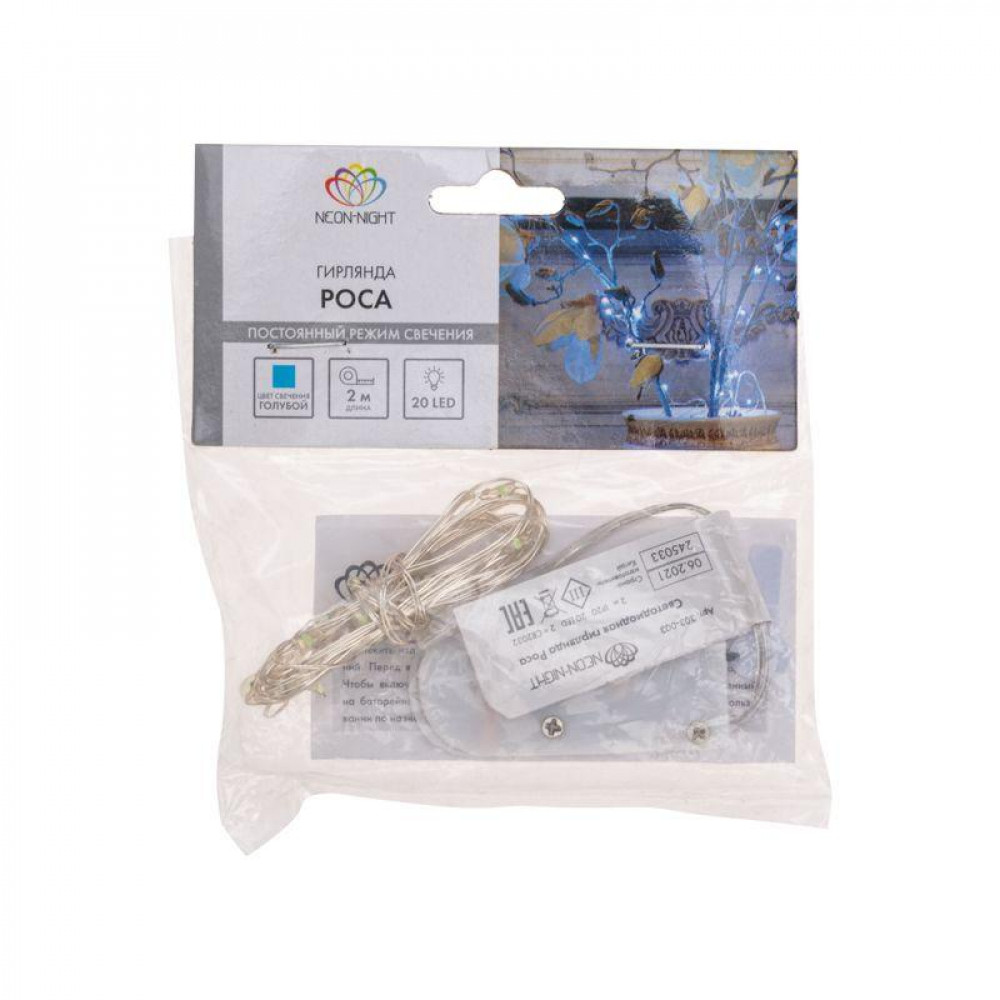 Гирлянда светодиодная "Роса" 2м 20LED голуб. 2Вт 4.5В IP20 провод прозр. элементы питания 2хCR2032 (в компл.) 303-003, Светильник декоративный