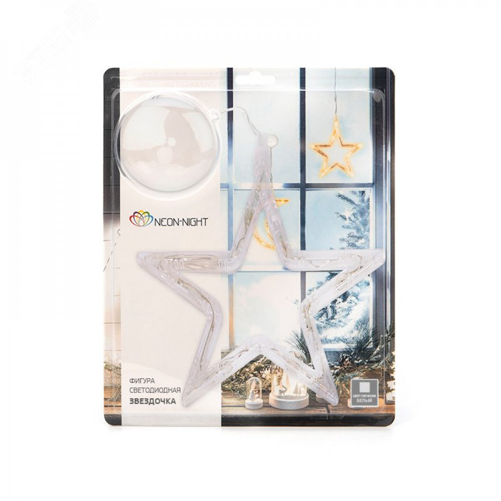 Описание Фигура светодиодная "Звездочка" 185х185х10мм 8LED тепл. бел. 1Вт 4.5В IP20 на присоске с подвесом элементы питания 3хAAA (в компл.) 501-011