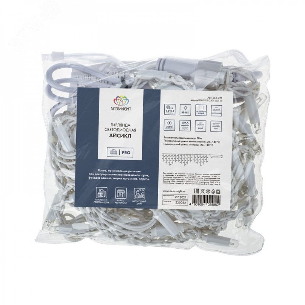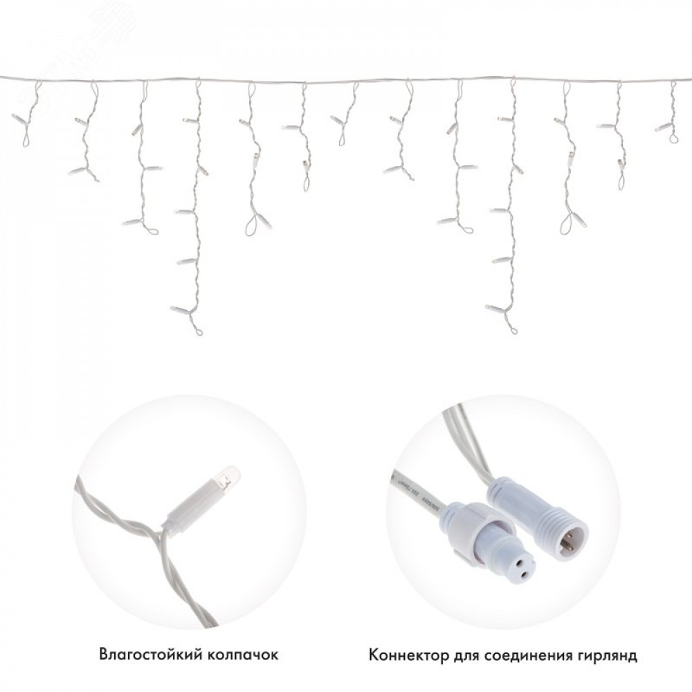 Гирлянда светодиодная "Айсикл" (бахрома) 1.8х0.5м 48LED бел. 3Вт 230В IP65 провод бел. 255-025, Светильник декоративный