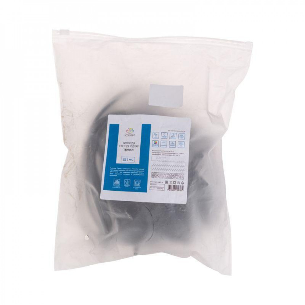 Гирлянду ''Твинкл лайт'' представляет собой общий провод с последовательно расположенными коротенькими отводами, направленными в разные стороны. На концах этих ''отростков'' расположены яркие светодиоды. Для создания праздничной светодинамики в общий провод встроен многопрограммный контроллер, который позволяет управлять 8 режимами свечения. Уличные гирлянды ''Твинкл лайт'' выпускаются длиной от 6 до 20 метров. Они прекрасно защищены от влаги, что делает их очень практичными.Ресурс светодиодов составляет 100 000 ч. ''Твинкл лайт'' используют в качестве елочной гирлянды для украшения как уличных, так и домашних елей. Также гирлянда широко применяется для оформления различных витрин, окон, колонн, элементов интерьера и разнообразных экспозиций.