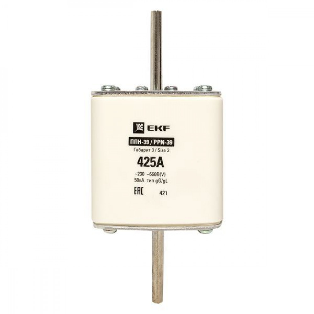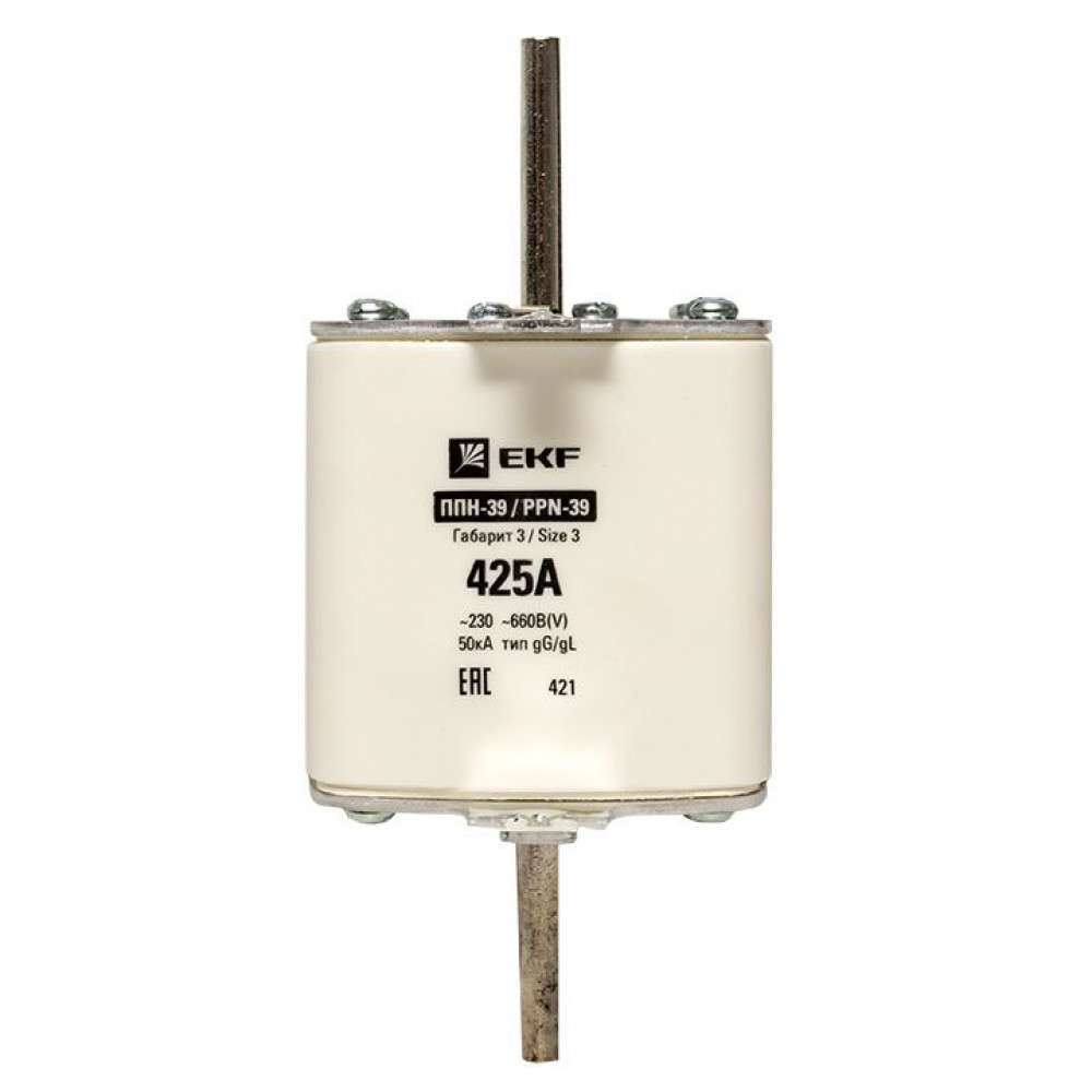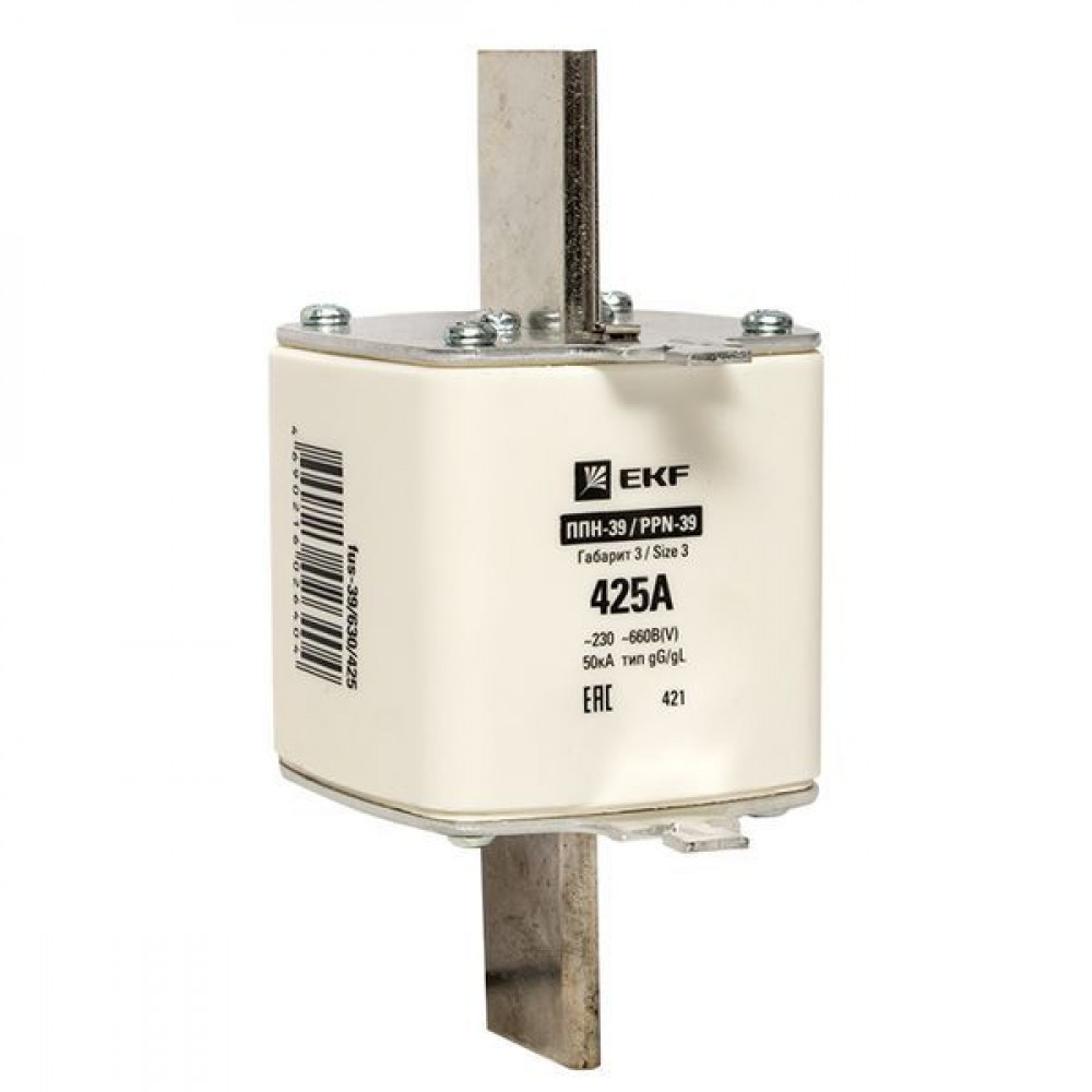 Плавкая вставка ППН-39 630/425А габарит 3 EKF. Предохранители плавкие ППН EKF, укомплектованные плавкими вставками типа gG/gL, предназначаются для защиты кабельных линий и промышленных электроустановок от токов перегрузки и короткого замыкания. Предохранители применяются в электрических сетях переменного тока частотой 50 Гц с напряжением до 660В. Применяются для крепления в распределительных и вводно-распределительных устройствах. Предохранители плавкие ППН могут устанавливаться в основание с держателем, а также в специально предназначенные рубильники. В комплект поставки предохранителей плавких ППН основание с держателем не входит и приобретается отдельно.