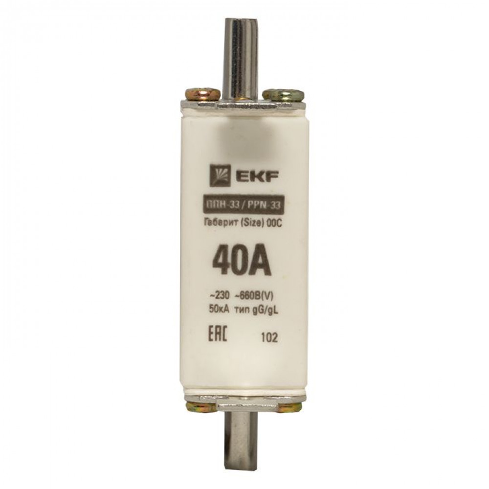Плавкая вставка ППН-33 100/ 40А габарит 00С EKF. Предохранители плавкие ППН EKF, укомплектованные плавкими вставками типа gG/gL, предназначаются для защиты кабельных линий и промышленных электроустановок от токов перегрузки и короткого замыкания. Предохранители применяются в электрических сетях переменного тока частотой 50 Гц с напряжением до 660В. Применяются для крепления в распределительных и вводно-распределительных устройствах. Предохранители плавкие ППН могут устанавливаться в основание с держателем, а также в специально предназначенные рубильники. В комплект поставки предохранителей плавких ППН основание с держателем не входит и приобретается отдельно.