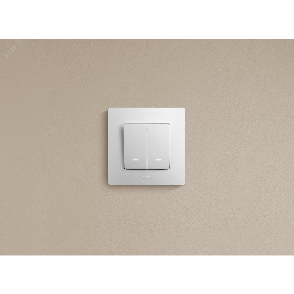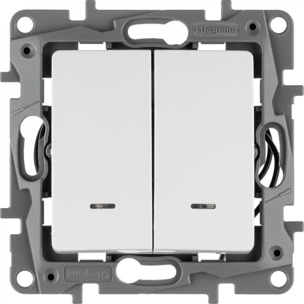 Выключатель с подсветкой двухклавишный Legrand Etika для скрытого монтажа, номинальный ток 10 А, цвет белый. Предназначен для управления двумя электрическими цепями.