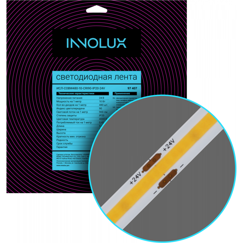 Описание Лента светодиодная 97 407 СДЛ-COBW480-10-CRI90-IP20-24V (уп.5м) INNOLUX 97407