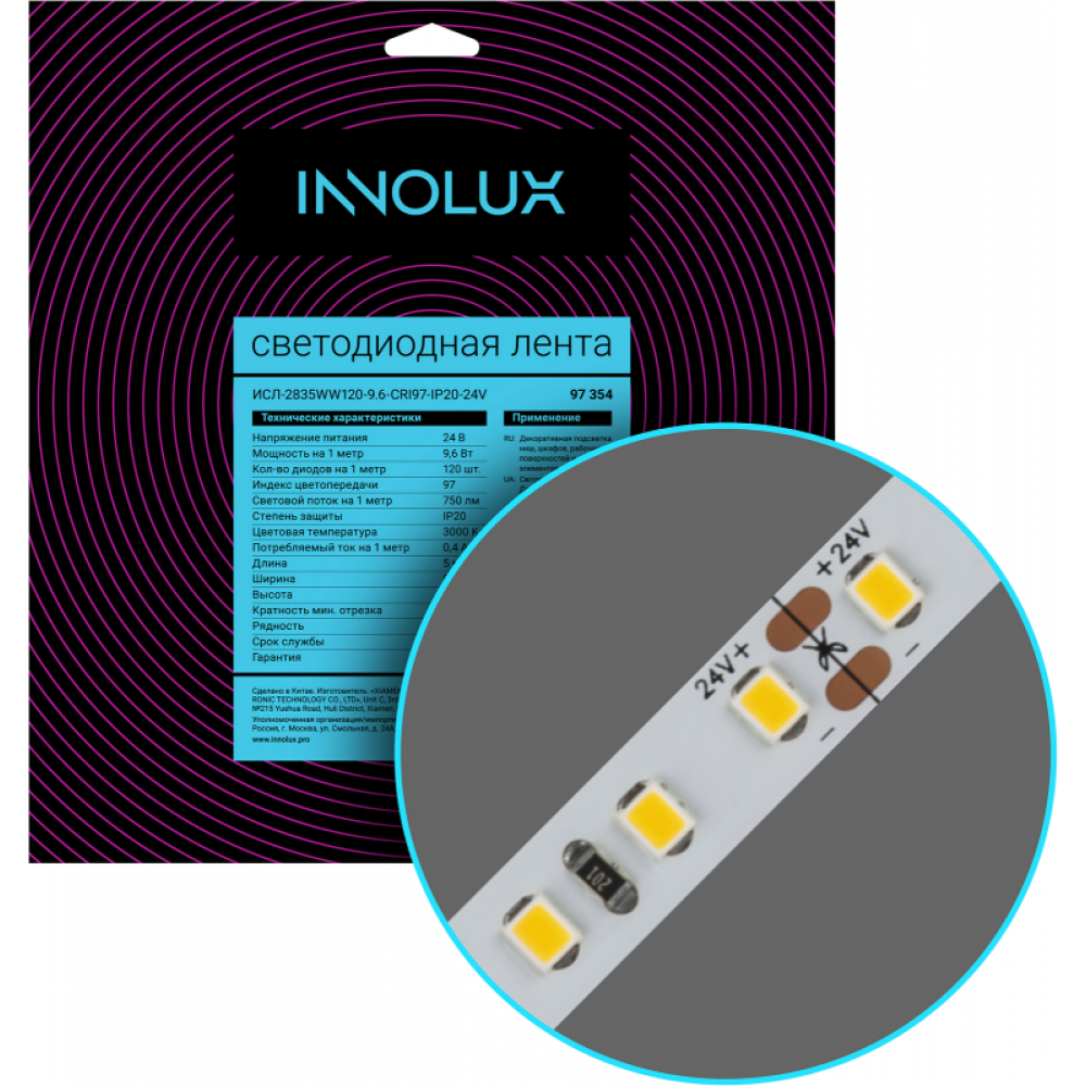 ← Лента светодиодная 97 357 СДЛ-2835W120-9.6-CRI97-IP20-24V (уп.5м) INNOLUX 97357
