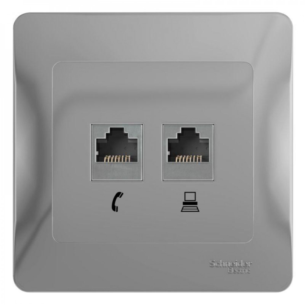 Описание Розетка компьютерная + телефонная 2-м СП Glossa RJ45 + RJ11 кат.5E механизм алюм. SE GSL000385