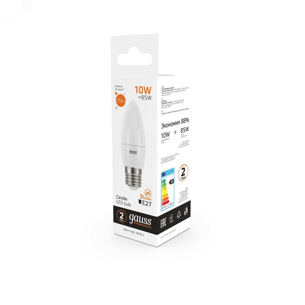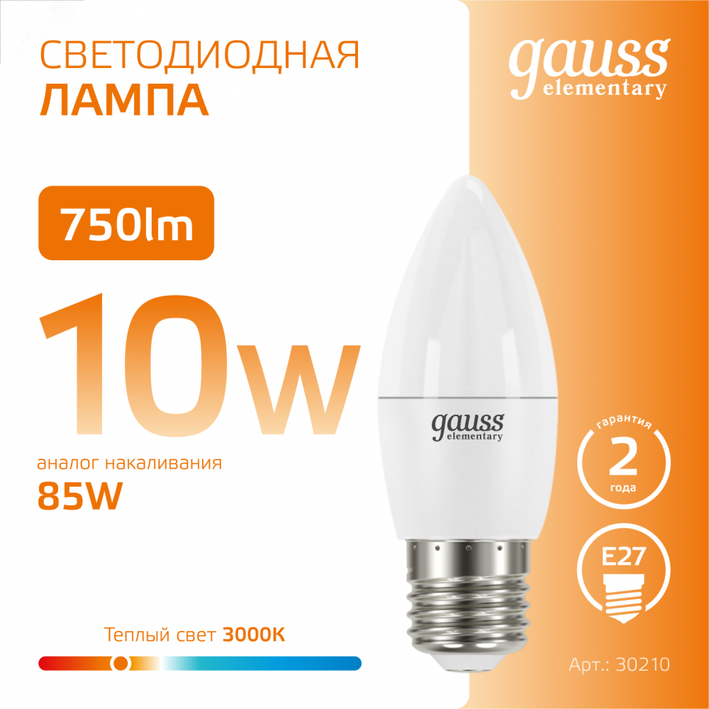 Описание Лампа светодиодная Elementary 10Вт свеча 3000К тепл. бел. E27 750лм 30210