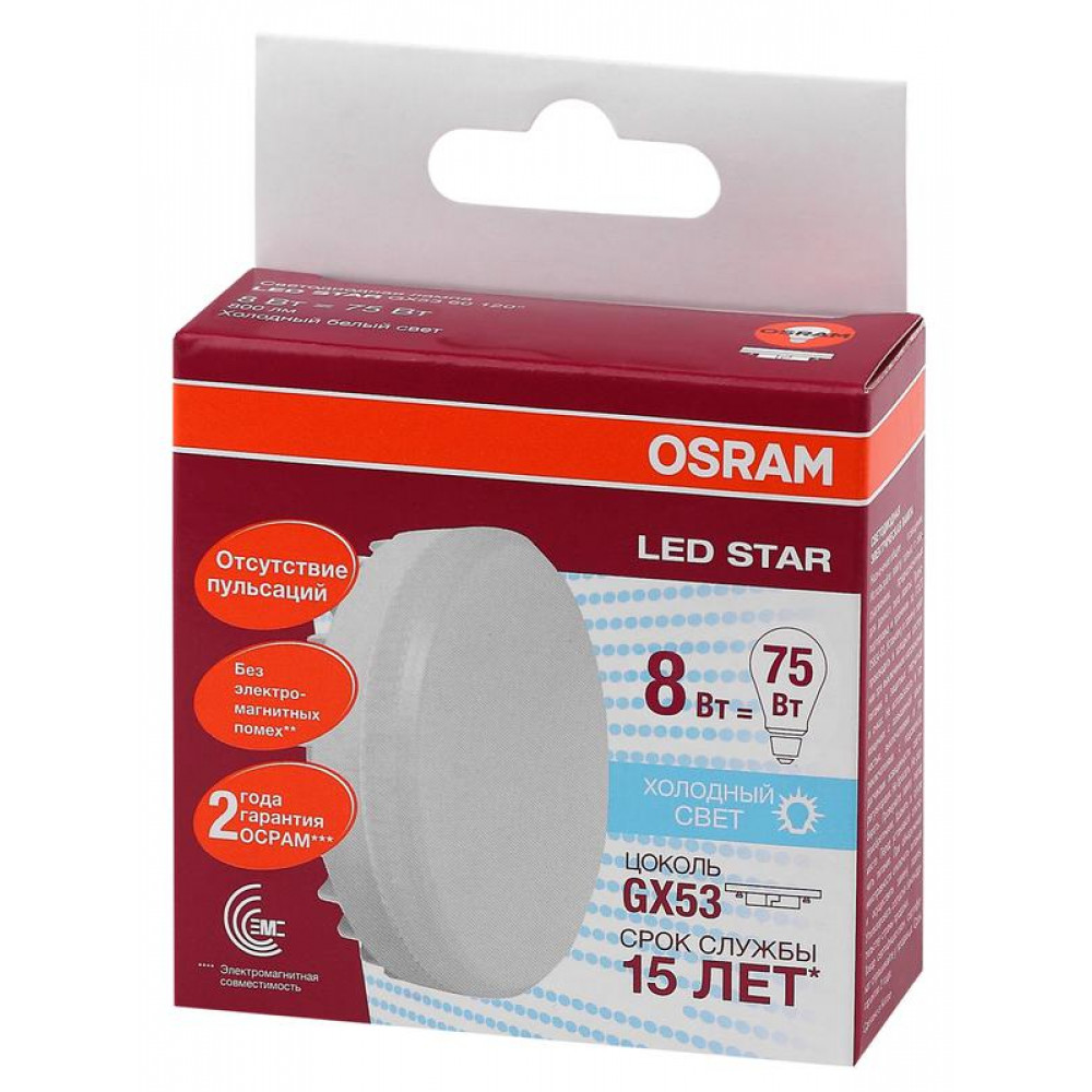 Лампа светодиодная LED Star GX53 8W/840 8Вт матовая 4000К нейтр. бел. GX53 800лм 220-240В 110град. пластик. (замена 75Вт) OSRAM 4058075210950, Лампа светодиодная