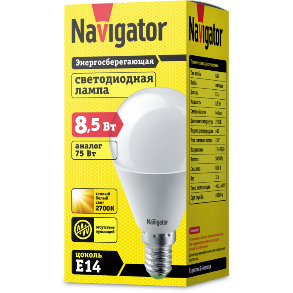 Описание Лампа светодиодная 61 333 NLL-G45-8.5-230-2.7K-E14 8.5Вт шар матовая 2700К тепл. бел. E14 640лм 176-264В 61333