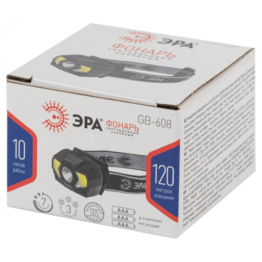ЭРА GB-608 – функциональный налобный LED-фонарь на батарейках (3 х ААА). В зависимости от ситуации применения позволяет выбирать любой из 7 (!) режимов свечения. Легко регулировать яркость, включать дальний направленный свет (сверхмощный светодиод нового поколения) или широкое заполняющее освещение (СОВ-матрица «мультикристалл на плате»), а также режимы аварийного мигания, SOS.