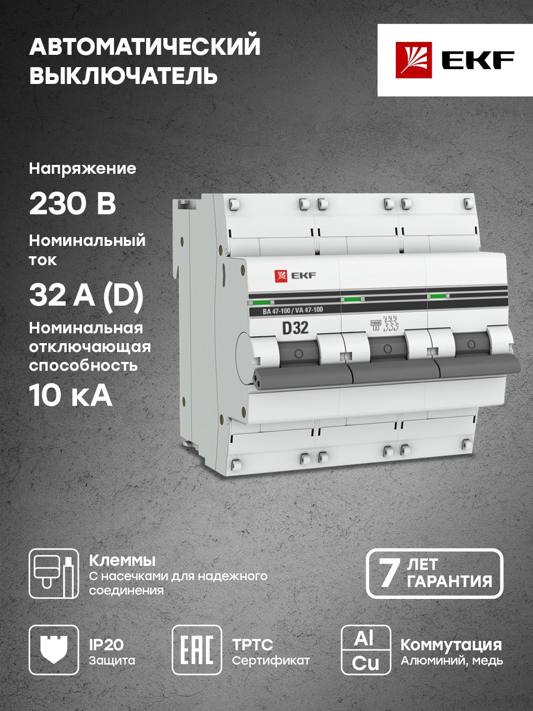 Описание Выключатель автоматический модульный 3п D 32А 10кА ВА 47-100 PROxima EKF mcb47100-3-32D-pro