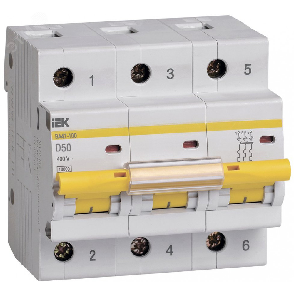 Описание Выключатель автоматический модульный 3п D 50А 10кА ВА47-100 KARAT IEK MVA40-3-050-D