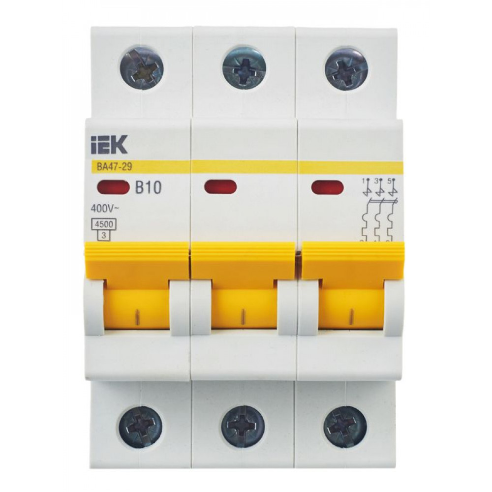 Описание Выключатель автоматический модульный 3п B 10А 4.5кА ВА47-29 KARAT IEK MVA20-3-010-B