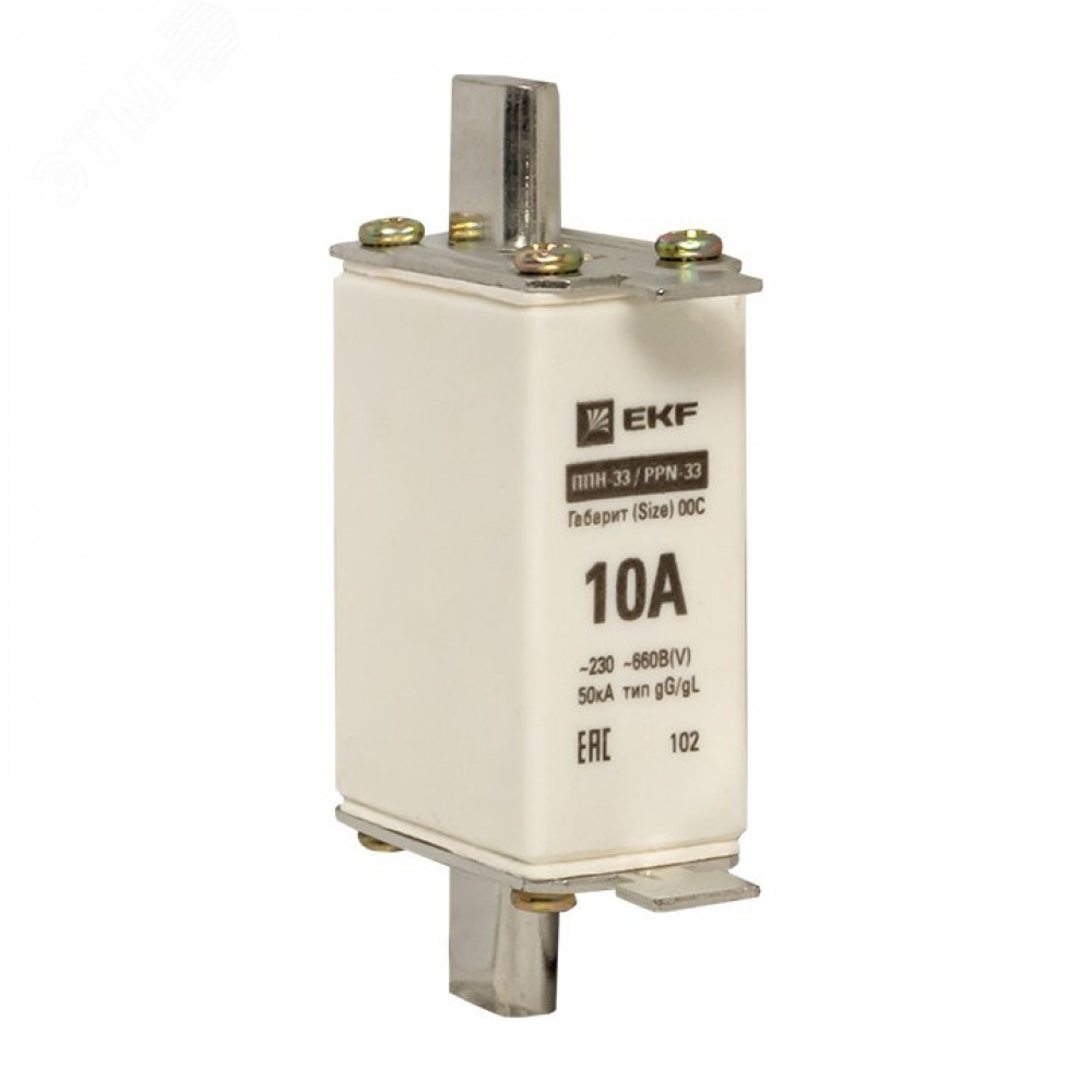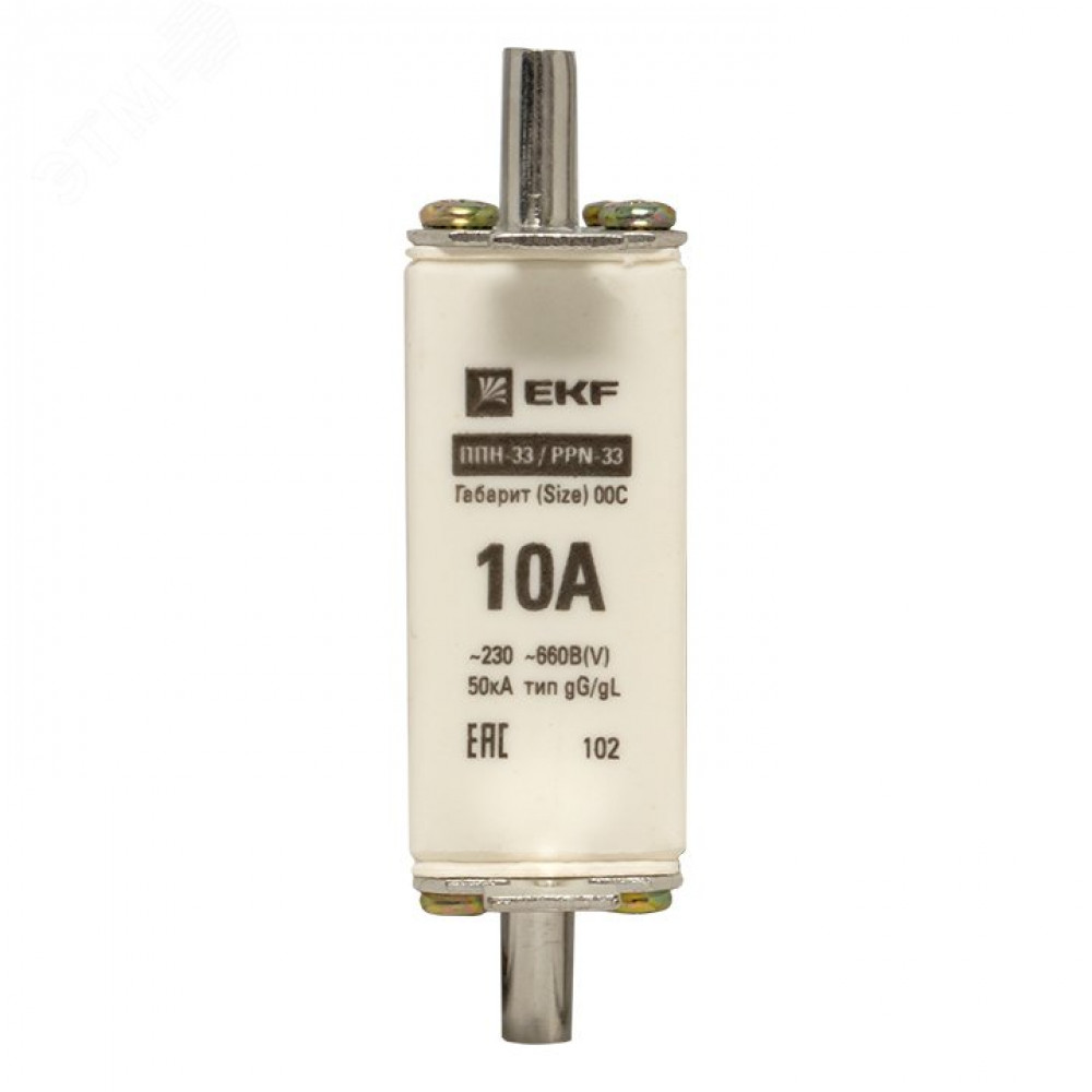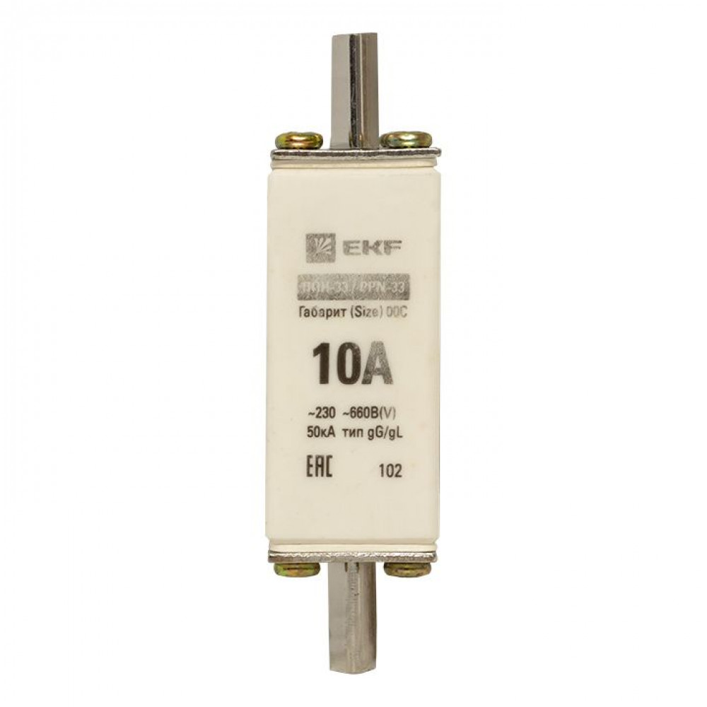 Плавкая вставка ППН-33 100/ 10А габарит 00С EKF. Предохранители плавкие ППН EKF, укомплектованные плавкими вставками типа gG/gL, предназначаются для защиты кабельных линий и промышленных электроустановок от токов перегрузки и короткого замыкания. Предохранители применяются в электрических сетях переменного тока частотой 50 Гц с напряжением до 660В. Применяются для крепления в распределительных и вводно-распределительных устройствах. Предохранители плавкие ППН могут устанавливаться в основание с держателем, а также в специально предназначенные рубильники. В комплект поставки предохранителей плавких ППН основание с держателем не входит и приобретается отдельно.