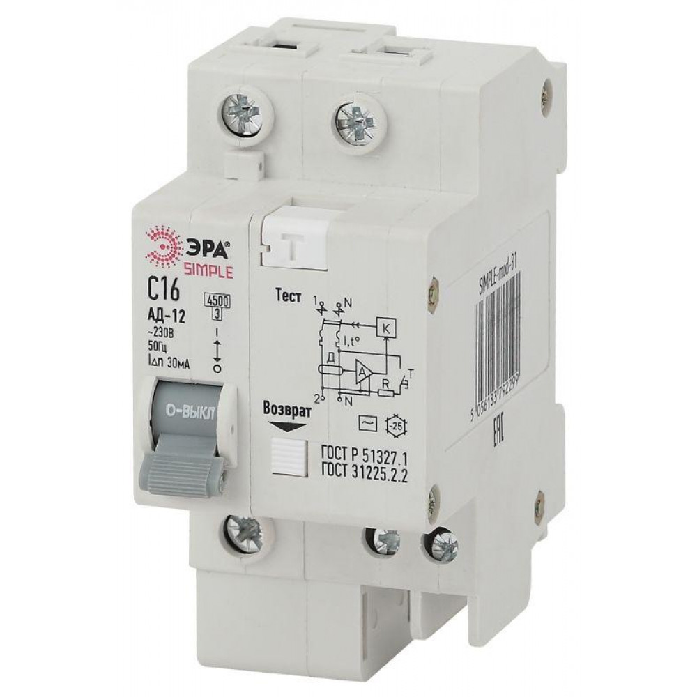 Выключатель автоматический дифференциального тока 2п (1P+N) C 16А 30мА тип AC SIMPLE-mod-29 Б0039287, Дифференциальная защита: УЗО, дифф блок