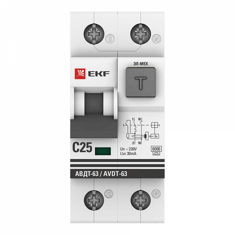 Описание Выключатель автоматический дифференциального тока 2п C 25А 30мА тип A 6кА АВДТ-63 2мод. электромех. PROxima DA63-25-30